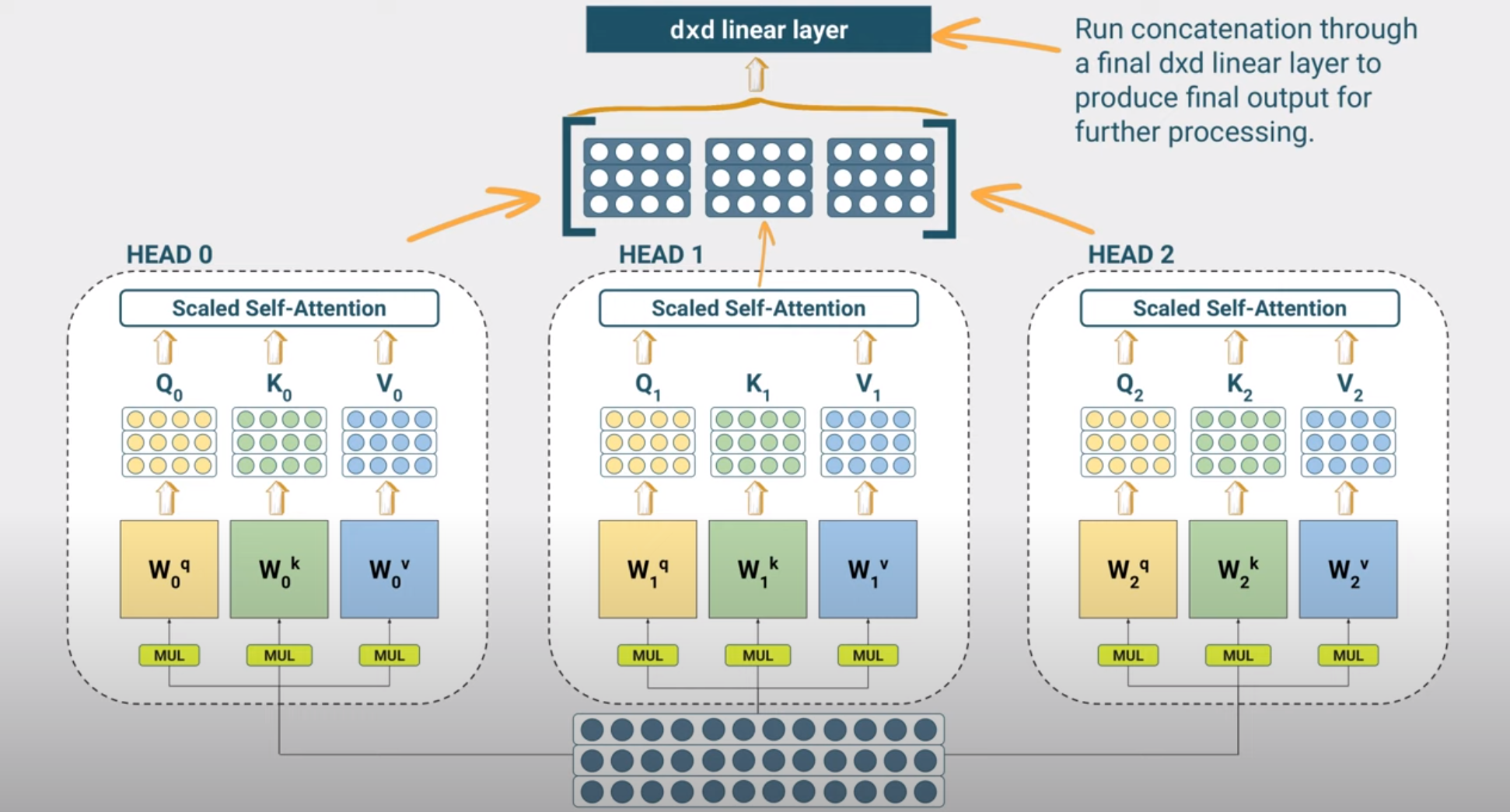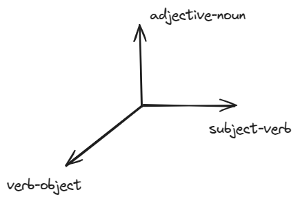 bear being in multiple grammatical patterns that also influence its meaning. For example, we have seen the subject-verb-object pattern and the subject-verb-adjective-subject pattern. To capture such multiplicities we can use multiple attention heads where each attention head learns a different pattern such as the three shown in figure below.