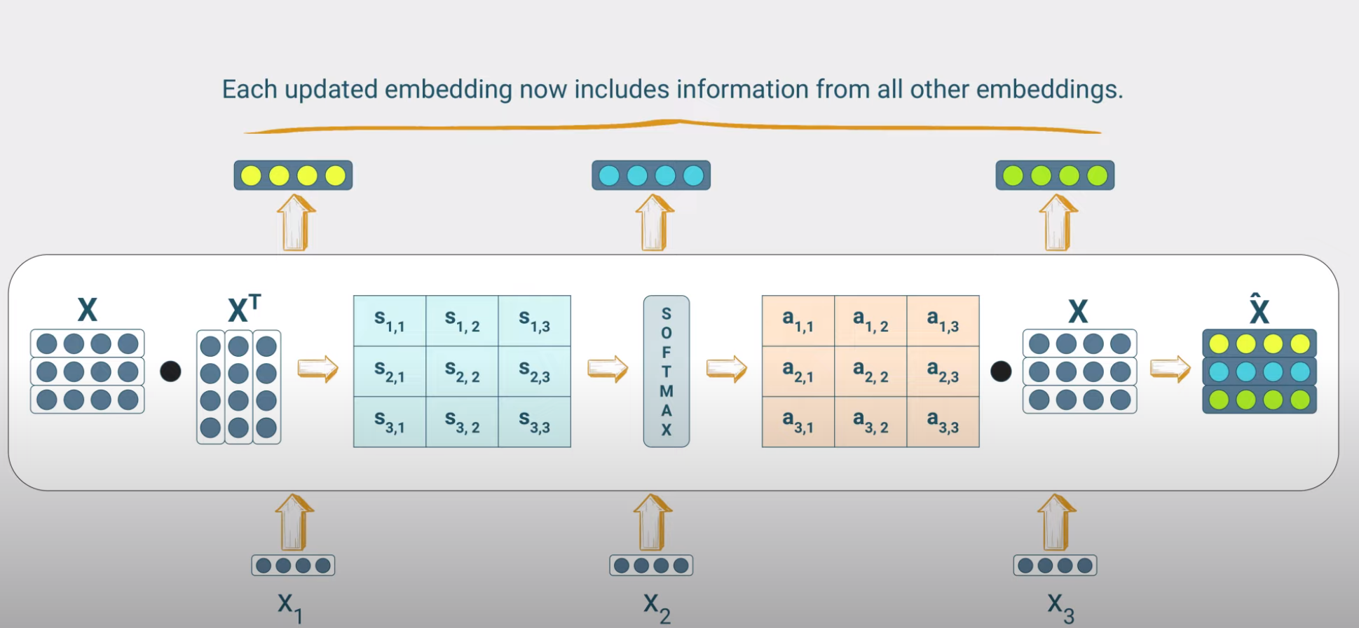 To achieve such mapping, we are enabling the other tokens to affect the initial coxtext-free representation via a simple dot-product mechanism that involves the input token and all other tokens in the context. Such attention mechanism is called simple self-attention and the ‘self’ refers to the token’s dot product with itself and each and every other token of the input context. This is shown in the next figure where we have formed the input context matrix with dimensions [T, d] where is the length of the input context and is the embedding dimension. In this example a token is [dx1] vector with and we have tokens. Minimal realistic values for the size of such matrices are and (Llama-2), although higher values are typically used.