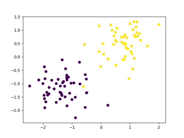 Maximum Likelihood Estimation (MLE) is a tool we use in machine learning to acheive a very common goal. The goal is to create a statistical model, which is able to perform some task on yet unseen data. The task might be classification, regression, or something else, so the nature of the task does not define MLE. The defining characteristic of MLE is that it uses only existing data to estimate parameters of the model. This is in contrast to approaches which exploit prior knowledge in addition to existing data.1 Today, we’re talking about MLE for Gaussians, so this is going to be a classification task. That is, we have data with labels, and we want to take some new data, and classify it using the labels from the old data. In the below images, we see data with labels (left), and new, unlabeled data (right). We want to be able to categorize each point from thenew data as belonging to either the purple group or the yellow group.