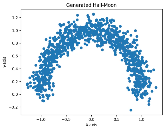 VAE is one of the answers to the aforementioned variational optimization problem. In this approach, we use a neural network to create the right structure instead of explicitly encoding it in the prior. This is not a new idea - sampling from a complex probability distribution can be achieved by feeding samples from a simple distribution to a suitably chosen function. In the example below, a function is used to change the mean of the standard normal distribution to generate a half-moon shape.